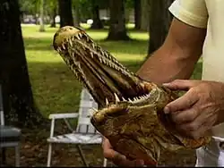 Lacépède first described the alligator gar in 1803. The original name was Lepisosteus spatula, but was later changed by E.O. Wiley in 1976 to Atractosteus spatula to recognize two distinct taxa of gars. Synonyms of Atractosteus spatula include: Lesisosteus [sic] ferox (Rafinesque 1820), and Lepisosteus spatula (Lacepede 1803). Fossils from the order Lepisosteiformes have been collected in Europe from the Cretaceous to Oligocene periods; in Africa and India from the Cretaceous; and in North America from the Cretaceous to recent times. The Lepisosteidae are the only extant family of gars with seven species, all located in North and Central America.[8] The fossil record traces the existence of gars such as the Alligator gar back over 100 million years ago to the Early Cretaceous period.[17] Despite being a highly evolved species, alligator gar are often referred to as "primitive fishes" or "living fossils",[18][19] because they have retained a few morphological characteristics of their earliest ancestors, with seemingly few to no apparent changes, such as: a spiral valve intestine, which is also common to the digestive system of sharks; an abbreviate heterocercal tail; and a swim bladder lung for breathing in both air and water.[8][20][21]