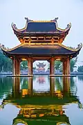 The New Bai Đính Pagoda (Bái Đính Tân Tự) encompasses an area of 700 hectares, located on Ba Rau hills, near the Hoàng Long River. This is a large complex which includes many structures built over several phases starting in 2003 and finally completed in 2010.[2] The temple's architecture follows traditional lines, consisting of large halls, courtyards and enclosures. The huge scale of Bai Dinh makes it strikingly different from previously built Vietnamese Buddhist pagodas, however. The largest structure, the Tam Thế Hall, rises to 34 m at its roof ridge and measures over 59 m in length.[2] The construction materials include locally quarried stone and timber from Ninh Bình and tiles from Bát Tràng (reinforced concrete was also employed owing to the scale of construction). The temple adheres to traditional Vietnamese design aesthetics with its curve finials and corner eaves soaring outward and upward, resembling a phoenix's tail. Artisanal works from local handicraft villages were selected for the interior, with bronze sculptures from Ý Yên, stone carvings from Ninh Van, wood carpentry from Phú Lộc, and embroidery from Ninh Hải.