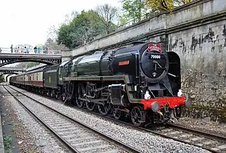 Following repairs in 2018 after a vibration problem was discovered in 2015,[11] the engine was moved to the Severn Valley Railway which included an appearance at the railway's autumn steam gala. Following the gala the engine was returned to Crewe and following a mainline test run the engine was given a repaint of its BR green which included replacement of the early crest for the later version.[12]