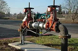 Backflow means the undesirable reversal of flow of a liquid, gas, or suspended solid into the potable water supply; a backflow preventer is designed to keep this from happening. Points at which a potable water system connects with a non-potable water system are called cross connections. Such connections occur naturally in appliances such as clothes washers and dishwashers, but they must be carefully designed and installed to prevent backflow. Another common location for a backflow preventer is the connection of a fire sprinkler system to a water main, to prevent pressurized water from flowing from the fire suppression system into the public water supply.