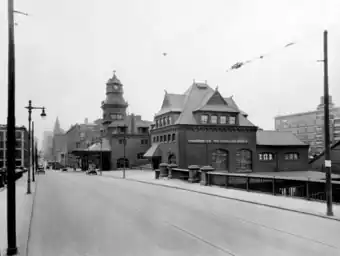 Philadelphia's Baltimore and Ohio Railroad station – also known as the B & O station or Chestnut Street station[2] – was the main passenger station for the Baltimore and Ohio Railroad in Philadelphia, Pennsylvania. Designed by architect Frank Furness in 1886,[3] it stood at 24th Street and the Chestnut Street Bridge from 1888 to 1963.[4]