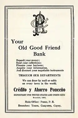 Banco Crédito y Ahorro Ponceño (Ponce Credit and Savings Bank) was the first bank in Ponce, Puerto Rico,[1] and one of the first two native Puerto Rican banks to be established in Puerto Rico.[2] The bank was the first one to introduce a bank credit card to the Puerto Rican market.[3] With over 50 branches throughout the island, the bank was one of the largest banking companies in Puerto Rico during most of the twentieth century.