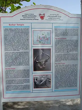 The Barbar Temple (Arabic: معبد باربار, romanized: Maʻbad Bārbār) is an archaeological site located in the village of Barbar, Bahrain, considered to be part of the Dilmun culture. The most recent of the three Barbar temples was rediscovered by a Danish archaeological team in 1954. A further two temples were discovered on the site with the oldest dating back to 3000 BC. The temples were built of limestone blocks, believed to have been carved out from Jidda Island.[1]