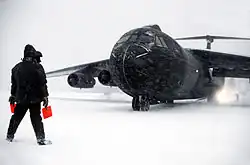 A flight line marshaler directs a C-141B during exercise Alloy Express, 1982.
