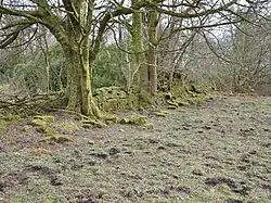 This wing was constructed in 1627 at right angles to the old keep using rubble faced with dressed with sandstone ashlar.[22] A door was broken through from the hall of the old keep to a staircase in the mansion house. The mansion was a fine specimen of 17th-century architecture.[18] It had turrets corbelled out at hall level and these contained closets. The front door was set in an unusual shallow projection and a narrow back door at the north facing aspect led into a courtyard. Two cellars existed with a passage between them that connected with the main staircase.[17] The hall in the old tower may have been used as a dining area and the large room in the mansion house utilised as a drawing-room.[18] The most southerly turret and a large part of mansion house wing fell at some point between 1956 and 1964.[23]