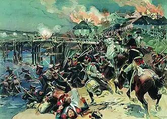 On 22 August 1812 a Russian attack took place on the right wing of the Prussians at Dahlenkirchen and Olai, and at the same time on the left wing at Schlock and St.Annen. On the right wing, Colonel Horn was completely surprised, and after some resistance he had to retreat. Ultimately, the Prussians were able to stop the attacks, but they gave up Dahlenkirchen because they could not defend it.[2]