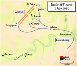 The Battle of Fleurus, fought on 1 July 1690 near Fleurus, then part of the Spanish Netherlands, now in modern Belgium, was a major engagement of the Nine Years' War. A French army led by Marshall Luxembourg defeated an Allied force under Waldeck.