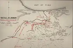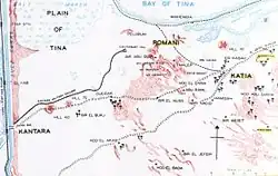 The 52nd (Lowland) Division developed a strong defensive position at Romani which had its left flank on the Mediterranean Sea, here a series of redoubts were built running southwards from Mahamdiyah along the line of high sand hills about 7 miles (11 km) to a dune known as Katib Gannit 100 feet (30 m) high. This line of sand hills, which were high enough to see Katia oasis from, marked the eastern edge of an area of very soft and shifting sand beyond which were lower dunes and harder sand where movement by both infantry and mounted forces was considerably easier. Between the shore at the western end of the Bardawil Lagoon and Katib Gannit (the principal tactical point on the eastern slopes of the Romani heights), the infantry constructed a line of 12 redoubts about 750 yards (690 m) apart, with a second series of redoubts covering the Romani railway station and the right of the defensive position which curved like a hook westward, then northward. A total of 18 redoubts were constructed, which when fully garrisoned held from 40 to 170 rifles each, with Lewis guns and an average of two Vickers machine guns allotted to each position; they were well wired on the right side of each of the positions, although there was no wire between the redoubts.[46] This defensive line was supported by artillery.[47][48]