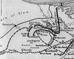 No major ground operations were carried out during these midsummer months, the Ottoman garrisons in the Sinai being scattered and out of reach of the British forces.[20] Constant patrolling and reconnaissance were carried out from Romani to Ogratina, to Bir el Abd and on 16 May to Bir Bayud, 19 mi (31 km) south-east of Romani, on 31 May to Bir Salmana 22 mi (35 km) east north-east of Romani by the New Zealand Mounted Rifle Brigade, when they covered 62 mi (100 km) in 36 hours.[21][22] These patrols concentrated on an area of great strategic importance to large military formations wishing to move across the Sinai along the northern route. Here water was freely available in a large area of oases which extends from Dueidar, 15 mi (24 km) from Kantara on the Suez Canal, along the Darb es Sultani (the old caravan route), to Salmana 52 mi (84 km) away.[23]