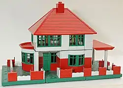 Bayko was primarily intended for the construction of model buildings. The rectangular Bakelite bases had a square grid of holes, spaced at 3/8 inch centres, into which thin metal rods, 75 thou [1.9 mm] in diameter, of various lengths, could be placed vertically. In order to make larger models, two or more bases could be joined together by means of metal links secured by screws through holes in the bases. Bakelite bricks, windows and other parts could then be slotted between pairs of rods in order to create the walls of the building. Other commonly used parts included floors (thin sheets of resin bonded paper with the same square pattern grid of holes as bases), and roofs of various types. There were also a large number of other more specialised parts.[4] In the original sets bases were large, and coloured brown; walls were brown/maroon and cream; roofs were deep maroon; and windows were a very dark green, but by 1937 the 'true' colours of red or white walls, green windows and red roofs were established, though bases were still large and brown.