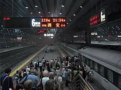 Beijingxi (Beijing West) railway station (Chinese: 北京西站; pinyin: Běijīngxī Zhàn), colloquially referred to as West Station (Chinese: 西客站), is located in western Beijing's Fengtai District. Opened in early 1996 after three years of construction, it was the largest railway station in Asia with an area of 510,000 m2 (5,500,000 sq ft),[1][2] before being surpassed by Shanghai Hongqiao railway station in platform capacity. The station serves in average 150,000–180,000 passengers per day with a maximum of 400,000 people per day.[3] It was expanded during the 2000s decade, during which several platforms were added. It also has a fairly large number of car-parking spaces.