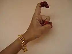 The gestures used in Bharatanatyam are called Hasta (or mudras). These symbols are of three types: asamyuta hastas (single hand gestures), samyuta hastas (two hand gestures), and nrtta hastas (dance hand gestures).[110] Like words in a glossary, these gestures are presented in the nritta as a list or embellishment to a prelim performance. In nritya stage of Bharatanatyam, these symbols set in a certain sequence become sentences with meaning, with emotions expressed through facial expressions and other aspects of abhinaya.[110] The basic standing position is called as Aramandi.