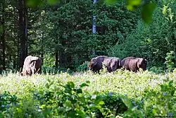 In 1923 it was known that only 54 European bison survived in zoos all around the world, none of them in Poland.[66] In 1929, a small herd of four was bought by the Polish state from various zoos and from the Western Caucasus (where the bison was to become extinct just a few years later). These animals were of the slightly different Caucasian subspecies (Bison bonasus caucasicus).[67] To protect them, in 1932 most of the forest was declared a national park.[68] The reintroduction proved successful, and by 1939 there were 16 bison in Białowieża National Park.[69] One of them, a male from the zoo in Pszczyna, is the founder of almost the entire population of bison that inhabits the forest,[70] he was descendant of a pair given to the Duke of Pszczyna by Tsar Alexander II in 1865.[71]