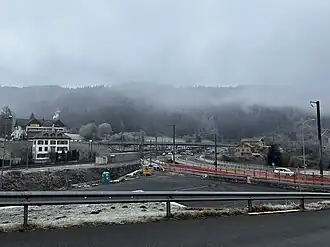 In 1877, a train station on the line Wädenswil–Einsiedeln railway was built, carrying the name of the village. Fourteen years later, the Südostbahn established the line Pfäffikon–Arth-Goldau railway line, and Biberbrugg became an important junction station. Around the train station, a settlement in the municipality of Einsiedeln was established on the southern side of the Biber river. Later, the motorway St. Gallen–Rapperswil–Schwyz–Ingenbohl on the western side of the river was built; this part of the village belongs to the municipality of Feusisberg.
