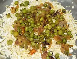 Bihari cuisine include litti chokha,[2] a baked salted wheat-flour cake filled with sattu (baked chickpea flour) and some special spices, which is served with baigan bharta,[3] made of roasted eggplant (brinjal) and tomatoes.[4][5] Dairy products are consumed frequently throughout the year, including dahi (yogurt), spiced buttermilk (known as mattha), ghee, lassi and butter.