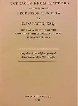 - ^ "DARWIN, Charles. For Private Distribution ... Extracts from Letters addressed to Professor Henslow by C. Darwin, Esq. Cambridge: [the University Press for the Cambridge Philosophical Society], Dec. 1, 1835". www.christies.com.