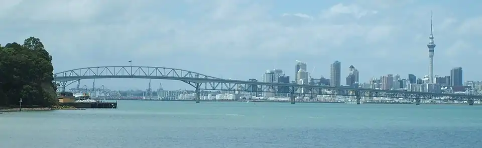 In the 1950s, Birkenhead was a semi-rural area of Auckland, with only the areas close to the Birkenhead Wharf having a suburban atmosphere.[80] In 1959, the Auckland Harbour Bridge opened, which rapidly brought Birkenhead closer to Auckland.[81] The North Shore wharves of the Waitematā Harbour stopped being major transport nodes, and instead, areas with views of the Waitematā Harbour rose in importance for suburban housing.[82] From 1960, the Birkenhead Borough Council encouraged construction of low-cost suburban houses in the borough, and a small state housing area was constructed at Hammond Place (near Highbury Pass).[71]