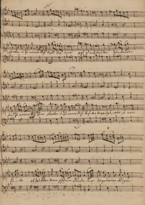 Early July 1733, Bach was still completing the composition, and the performance parts he intended to send to Dresden.[27] Around this time, there are the earliest documented signs he used cantatas composed by Stölzel for performance in Leipzig.[28] He may have performed two cantatas from Stölzel's Namebook cycle, for the fifth and sixth Sunday after Trinity, in July 1733: his copies of these cantatas date from around this time.[28] He performed Stölzel's Ein Lämmlein geht und trägt die Schuld on Good Friday 23 April 1734, and likely Stölzel's entire String-Music cantata cycle from 1735 to 1736.[6][7][29][30] Around the same time, that is, likely somewhere between 1734 and 1740, Anna Magdalena Bach entered a version for voice and continuo of "Bist du bei mir", an aria from Stölzel's 1718 Diomedes opera, in her second notebook.[2][6][9][31]