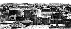 By 1874 there were 123 refineries in what would become known as "Black City".[4] The refinery district was about 8 miles (13 km) from the shipping ports.[5] An industrial area plan was completed in 1876. Some of the farms and pastures of the neighbouring village of Keshla were zoned to accommodate replacements for factories that had been dismantled in the city. The new industrial zone was 2 kilometres (1.2 mi) from residential areas. To prevent further pollution, the new zoning law prohibited oil refineries from being built within the residential area.[3] By 1880, there were 118 industrial businesses functioning in the Black City area.[3]