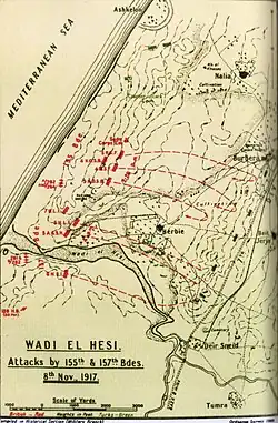 The brigade continued leading the pursuit up the coast, marching through soft sand towards Esdud. The attack on Esdud was directed by 7th HLI on the left under Lt-Col Gibbons, with 5th Argyll and Sutherland Highlanders on the right, and darkness fell before the assaulting troops reached the hills that formed the objective, but they went through the Turkish defences with the bayonet. Casualties at this stage had been low, but consolidation had to be carried on under machine gun fire illuminated by flares, and fighting of several small counter-attacks. After midnight a serious counter-attack came in, with the Turks rushing the right hand part of 7th HLI's position. Private Jack with a Lewis gun maintained the end of the line, and Lt-Col Gibbons led an attack back up the hill, rifle in hand, to restore the position. 7th HLI had lost 5 ORs killed and 2 officers and 23 ORs wounded, but the Turkish position had been cracked open, the EEF's advance continuing next morning.[48]