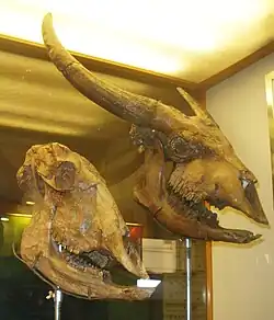 The bovinans have a rich fossil record.[12] According to the fossil record and molecular studies, Bubalina and Bovina diverged from one and another from a common ancestor around 13.7 million years ago in the Late Miocene.[1][6][12] After arriving into Africa there was a rapid radiation of bovinan species in Africa in the Middle Pliocene. Among the diverse genera of African bovinans were two significant genera: Pelorovis and Leptobos. According to anatomical and morphological study on the various species of Pelorovis and Leptobos, it is believed the former genus evolved into Bos while the latter genus evolved into Bison during the Late Pliocene of East Africa.[16][17] Both lineages then left Africa and into Eurasia at the end of the Pliocene. While Bos inhabited much of Eurasia, some species of Bison had colonized North America by crossing over the Bering Land Bridge in two waves, the first being 135,000 to 195,000 years ago and the second being 21,000 to 45,000 years ago.[18][19][12] The exact relationships between fossil and extant bovinans problematic.[20]
