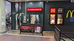 Beginning in early 1983, construction started on rebuilding the station below ground, as part of the project to eliminate the level crossing at Station Street, which was at the eastern end of the station.[3] Box Hill Central Shopping Centre and the bus terminus were built over the top of the station, with the complex being completed in 1985.[3] Platform 1 was used between 24 April 1983 and 9 June 1984,[3] while the rest of the new station was being built, and has been retained for possible future use. The platform has no track or lighting, and a McDonald's restaurant has been built over the ramp from the station concourse.