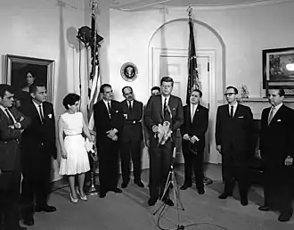 In 1958, the booing received by Vice President Nixon on a tour of several Latin American countries alerted the Eisenhower administration to the poor image of the U.S. in the region.[12][13] The Cuban Revolution in 1959 and subsequent events led to a turnaround in Latin American politics.[14][15][16] Attempts to achieve a moderate government, as late as 1959, failed. The following year, the quota on Cuban sugar exports was suspended.[16] In his presidential campaign Kennedy criticized the American leadership's complacency with Latin America.[17] In 1961 the military attempt to change the regime in Cuba, the Bay of Pigs invasion, failed,[18] while Fidel Castro announced the implementation of socialism[19] and his county's alignment with the Soviets.[16] In 1962 the Cuban Missile Crisis tipped the balance of power in the region in favor of the United States, which allowed pressure to be put on reluctant countries such as Brazil.[20]