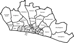 The 2001 boundary review[6][2][3] reduced the wards to 21 wards with a mix of two or three councillors each totalling 54 councillors for the then city council. These boundary were used in the 2003 election for the first time with the following wards:[7]