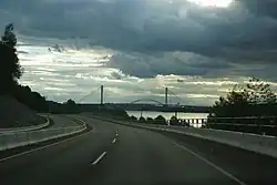 On the Mainland, Highway 17 is known as the South Fraser Perimeter Road (SFPR), a component of the British Columbia Ministry of Transportation's Gateway Program. It is a four-lane highway with a mix of freeway and expressway sections. The highway has a speed limit of 80 km/h (50 mph) over most of its length, connecting the Tsawwassen Ferry Terminal and Highway 99 in Delta to Highway 1 at 176th Street in Surrey, and providing access to all five of the major Fraser River crossings in Metro Vancouver.[5] The mainland section is notable for its extensive use of noise walls, split level construction through Delta and use in some urban sections of so-called Quiet Pavement to reduce traffic noise.[6]