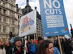 The Health and Social Care Act 2012 changes, and the private finance initiative have been opposed by protests and groups like "Keep Our NHS Public". Since 2012, with more private money, the cost of the NHS has risen without better outcomes.[34]