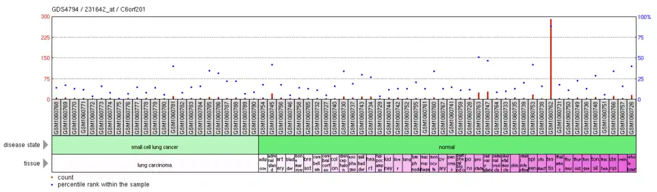 - ^ "C6orf201 Small cell lung cancers - Homo sapiens". National Center for Biotechnology Information Search database. Retrieved 9 May 2015.
