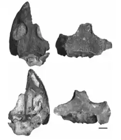 Cacops was a medium-sized dissorophid, being smaller than later dissorophids from Eurasia such as Kamacops. Like other dissorophids, Cacops had osteoderms associated with the vertebral column. Internal osteoderms are fused to the neural spines, while external osteoderms overlapped adjacent positions with a ventral flange that inserted between successive internal osteoderms.[10][11] The osteoderms are associated with only the first 15 vertebrae, beginning at the axis. They are relatively narrow, especially posteriorly, and are subrectangular in dorsal profile, except for the first osteoderm which is more triangular.[5] The osteoderms also have dermal pitting on their dorsal surfaces. The distributions of these pits are not random, but rather found along the raised edges of the midsagittal groove and often in the groove as well.