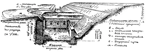 Originally the term referred to a covered passageway that traversed the ditch outside the curtain of a fortress. Fire from this point could cover the ditch beyond the curtain wall to deter any attempt to storm the wall.[3] Thus the passageway was equipped with musket ports and cannon ports that fired along the ditch.