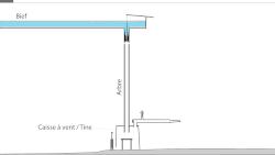 A defining feature of the Catalan forge is the necessity for a relatively elevated head, ranging from 7 to 10 meters. The water is directed into a wooden receptacle, the paicherou, and allowed to flow down a vertical pipe, the shaft. Typically, two shafts are in operation concurrently. The shaft is constructed from a tree trunk bisected and subsequently hollowed out. Subsequently, iron bands are affixed to join the two components. At the upper extremity of the pipe, apertures are created at oblique angles, descending inwards and serving as aspirators. The shaft opening is closed by movable wedges, operated from below, which regulate the water flow. The lower extremity of the shaft culminates in a sizable trapezoidal wooden receptacle designated as the "wind box." The water flows into the wind box, which is directed onto a bench-like structure protected by a stone slab. It then exits the wind box through a sliding door. As the water descends, air is drawn in through the suction tubes, resulting in a mixture of water and air that flows into the box. The pressurized air is then conveyed through a quadrangular duct, designated as the "man or sentinel," and subsequently through a nozzle to the upper portion of the firebox. Consequently, the proboscis offers a permanent and automated solution for the ventilation of the firebox, which can be precisely regulated by varying the flow rate.[1][2]