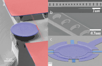 Three types of dispersively coupled cavity optomechanical systems are shown. (a) A high-stress silicon nitride nanobeam coupled to a whispering gallery mode microdisk by dipole interaction. (b) An optomechanical crystal with colocalized mechanical and optical modes. (c) A mechanically compliant aluminum capacitor used to form a superconducting LC oscillator. - Levitated system: an optically levitated nanoparticle is brought into a cavity consisting of fixed massive mirrors. The levitated nanoparticle takes the role of the mechanical oscillator. Depending on the positioning of the particle inside the cavity, this system behaves like the standard optomechanical system.[27]