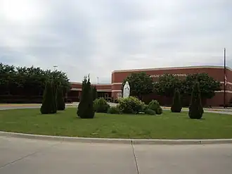 Church officials began discussing sites for a new school building in 1996, initially considering a west side location in the former Chicago & Alton railroad yards.[45] This site was later rejected due to the large amount of environmental cleanup needed.[46] In February 1998, school officials announced plans to construct a new school building in east or southeast Bloomington after renovation of the existing building was deemed too expensive.[44][47] That July, the pastors' board announced fifteen acres of Deneen family farmland in east Bloomington were reserved for a new school building.[48] An $11 million fundraising effort to build a new school on the land gifted to the diocese began in 2001.[10][49]