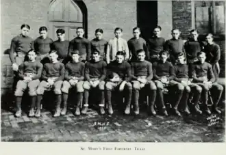 CCHS has roots in St. Mary's School, built at a cost of $26,000[nb 3][30] by Holy Trinity Parish in 1884 during the pastorate of Michael Weldon.[7]: 152 The building was located at the northeast corner of the intersection of Locust and Center Streets in Bloomington, Illinois.[31] Initially only a grade school, the building was altered in 1886 to add high school classes. Two graduates in 1898 composed the high school's first graduating class. The parish paid off the debt for the school building in 1909. In 1912 Illinois State University and the University of Illinois recognized St. Mary's high school curriculum. The graduating class that spring had twenty students.[10]