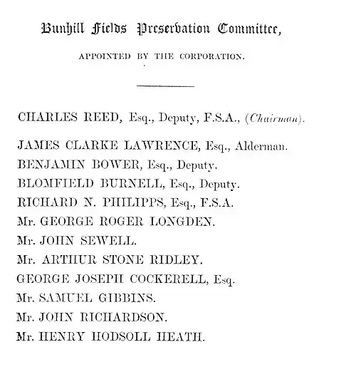 In a move to prevent the land from being built upon on expiry of a longstanding lease, the Corporation of the City of London formed a special Bunhill Fields Burial Ground Committee in 1865, which became formally known as the Bunhill Fields Preservation Committee. The committee, appointed by the corporation, consisted of twelve advisors under Reed's chairmanship. Following the work of the committee, the City of London Corporation obtained an Act of Parliament in 1867 for the Preservation of Bunhill Fields Burial Ground as a public open space with seating, gardens, and for the restoration of some of its worthiest monuments, including one to Daniel Defoe funded by The Christian World and unveiled by Reed. The new park was opened by the Lord Mayor on 14 October 1869.[14]