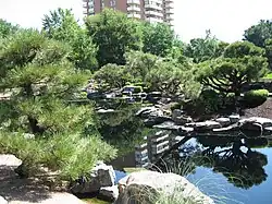 By the 1970s the pavilion and supporting plinth were in a state of serious disrepair. City authorities undertook a restoration of the pavilion but decided to replace the platform altogether with gently sloping lawns and modest concrete staircases. Today only the pavilion and reflecting pools remain of the original complex.[11] The new grading meant that much of the original formal landscaping was lost during this period, replaced with simplified flower beds and a rose garden to the north.[12]