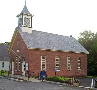 The building, a one-story rectangular brick building with a gabled roof covered in asphalt shingles, was constructed in 1875.[3] It is pierced at the east (front) end by a square frame bell tower with paired arched louvered vents on all four sides. The roof overhangs the walls with a broad fascia; there is no other attempt at ornament.[2]