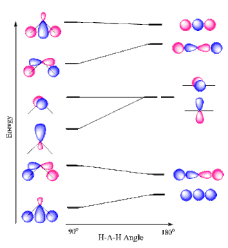 2O is shown on the right.[2][3] Following simple symmetry treatments, the 1s orbitals of hydrogen atom are premixed as a1 and b1. Orbitals of same symmetry and similar energy levels can then be mixed to form a new set of molecular orbitals with bonding, nonbonding, and antibonding characteristics. In the simple MO diagram of H