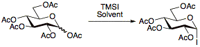 Glycosyl iodides were first introduced for use in glycosylation reactions in 1901 by Koenigs and Knorr[6][7] although were often considered too reactive for synthetic use. Recently several research groups have shown these donors to have unique reactive properties and can differ from other glycosyl chlorides or bromides with respect to reaction time, efficiency, and stereochemistry.[8][9][10][11] Glycosyl iodides may be made under a variety of conditions, one method of note is the reaction of a 1-O-acetylpyranoside with TMSI.[12]