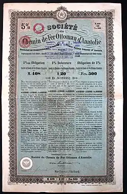 The Chemins de Fer Ottomans d'Anatolie (Turkish: Osmanlı Anadolu Demiryolları, English: Anatolian Railway), founded on 4 October 1888, was a railway company that operated in the Ottoman Empire.[1] The company was headquartered in Istanbul.