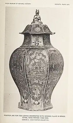 Ming Pewter Jar for tea leaves decorated with scenes inlaid with brass.