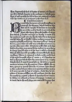 A Dutch edition of Le Livre de la cité des dames exists from the 15th century.[64] In 1521 The Book of the City of Ladies was published in English.[64] Livre des fais d'armes et de chevalerie was translated into English by William Caxton for Henry VII in 1489 and was published under the title The Book of Feats of Arms and of Chivalry as print one year later,[69] attributing Christine as author.[67] English editions of The Book of the City of Ladies and Livre du corps de policie (The Book of the Body Politic) were printed in 1521 without referencing Christine as the author. Elizabeth I had in her court library copies of The Book of the City of Ladies, L'Épistre de Othéa a Hector (Letter of Othea to Hector) and The Book of Feats of Arms and of Chivalry. Among the possessions of the English queen were tapestries with scenes from the City of Ladies.[70]