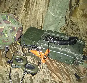 A vehicle-mounted VHF FM transceiver built by Marconi Space and Defence Systems. The frequency range and channel separation is the same as the 351/352 with output power settings up to 50 W.[9] Antenna systems are provided to provide improved performance in semi-static situations such as an elevated broadband vertical dipole mounted on an 8-metre mast.[10] The VRC 353 is also capable of data transmission and when used in conjunction with an add-on unit (Digital Master Unit) provides a medium level secure speech network.