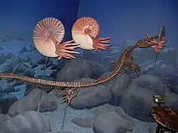 It was one of the earliest hydropedal[note 1] mosasaurs, representing one of the first properly marine predatory forms alongside other early hydropedal genera like Tylosaurus and Platecarpus.[2] It was likely an agile swimmer that preyed upon cephalopods, fish and other small vertebrates in shallow water. Isotopic analysis on teeth specimens has suggested that this genus and Platecarpus may have entered freshwater occasionally, just like modern sea snakes.[3]