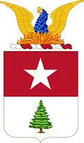 The coat of arms was initially approved in 1919 for the Coast Defenses of Portland.[44] It was later approved for the 8th Coast Artillery Regiment on 13 March 1924. It was amended to correct the translation of the motto on 31 March 1928. The insignia was redesignated for the 27th Antiaircraft Artillery Automatic Weapons Battalion on 14 January 1952.[2][43]