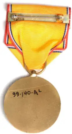 The ribbon consists of a broad yellow band edged with three 1⁄32-inch (0.79 mm) stripes of (from interior to exterior) blue, white, and scarlet.[5] Because all six medals authorized in 1988 are identical, only the ribbons authorized in 1945 that the medals are suspended from distinguish the medals from one another.