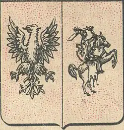 The Podlaskie Voivodeship of Congress Poland was established on 16 January 1816.[3] Its coat of arms was divided vertically into two fields. The left half depicted a white eagle with yellow (golden) legs, with risen wings. The right half depicted a knight in a white (silver) armor, sitting on a white (silver) horse with a blue saddle and shabrack, standing on its back hoofs. The knight has a blue shield with a yellow (golden) cross of Lorraine on it, put on his left arm, and hold a sword in his right hand.[4] The voivodeship existed until 23 lutego 1837, when it was replaced by the Podlachian Governorate, which continued using said coat of arms. It ceased to exist in 1844, when it was incorporated into the Lublin Governorate.[4][5]
